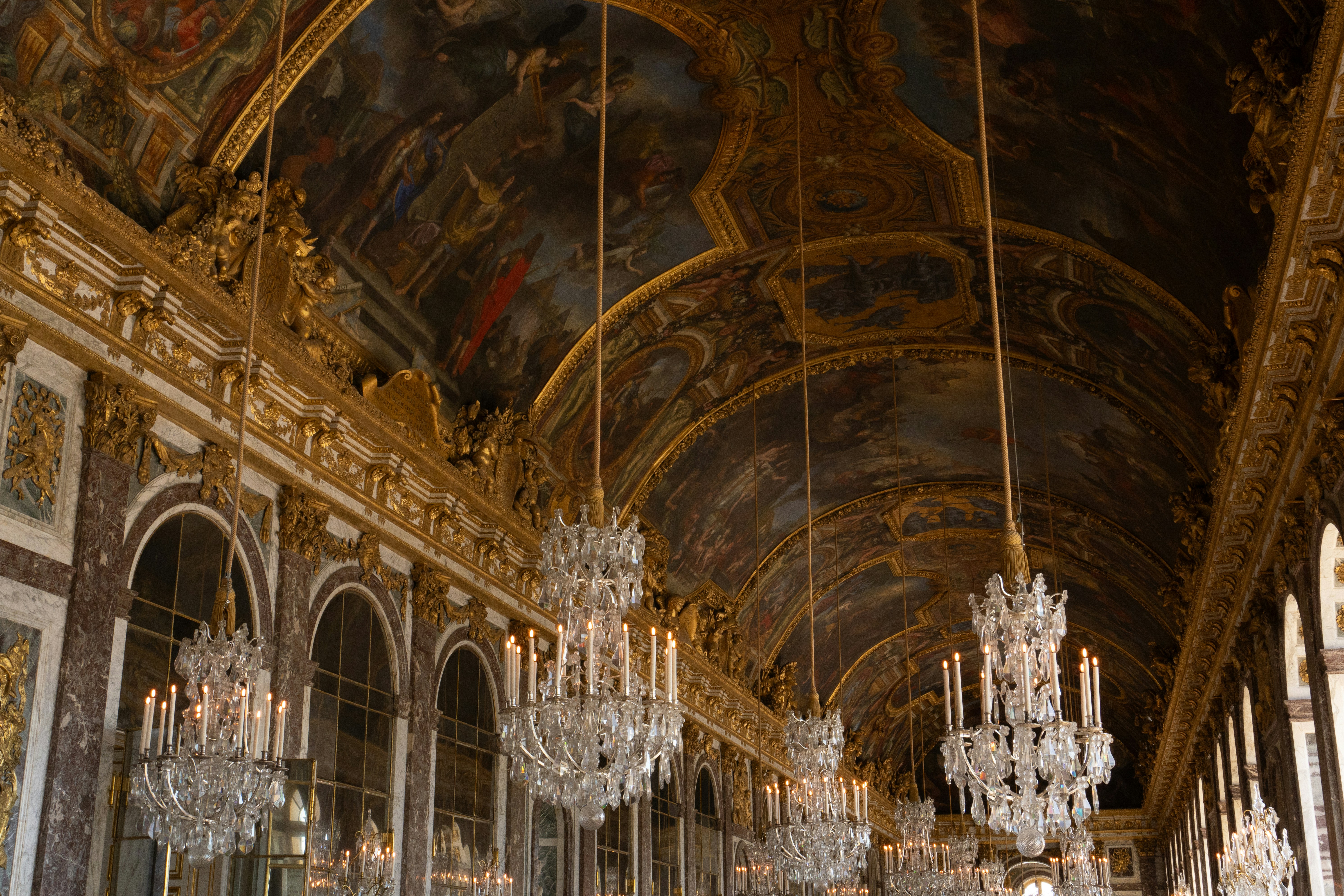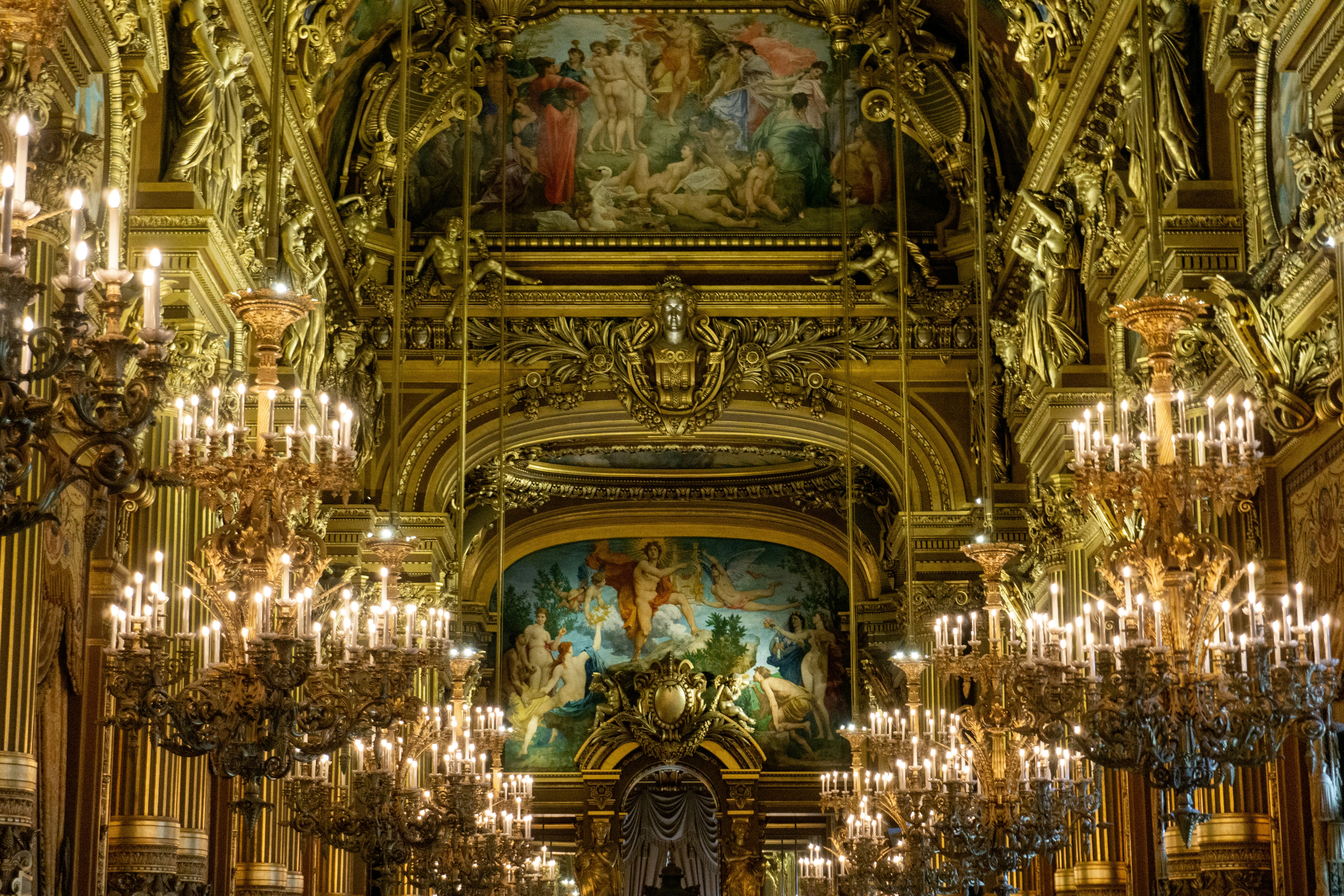 a large ornate room with chandeliers and paintings on the walls