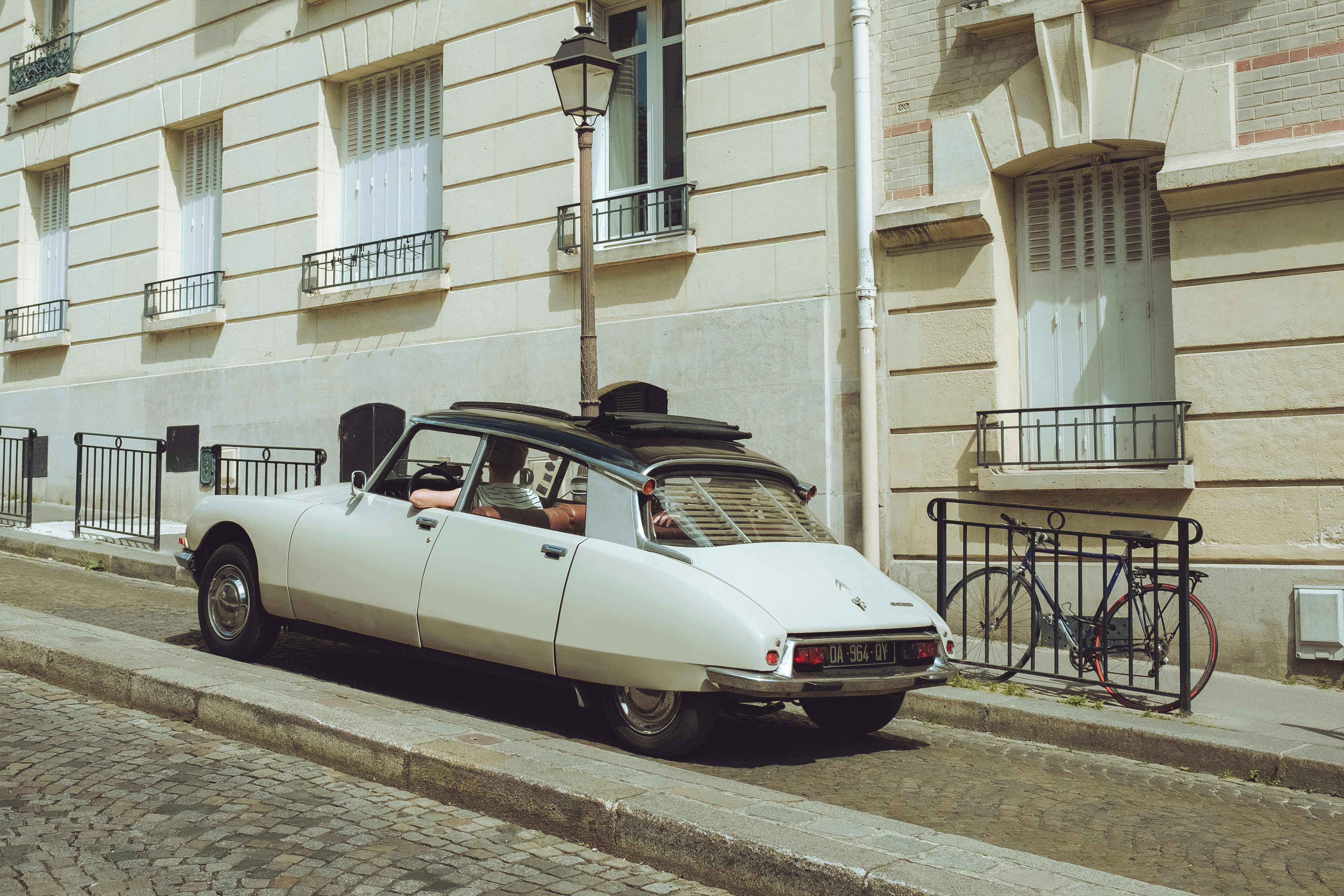 a white car parked on the side of a street