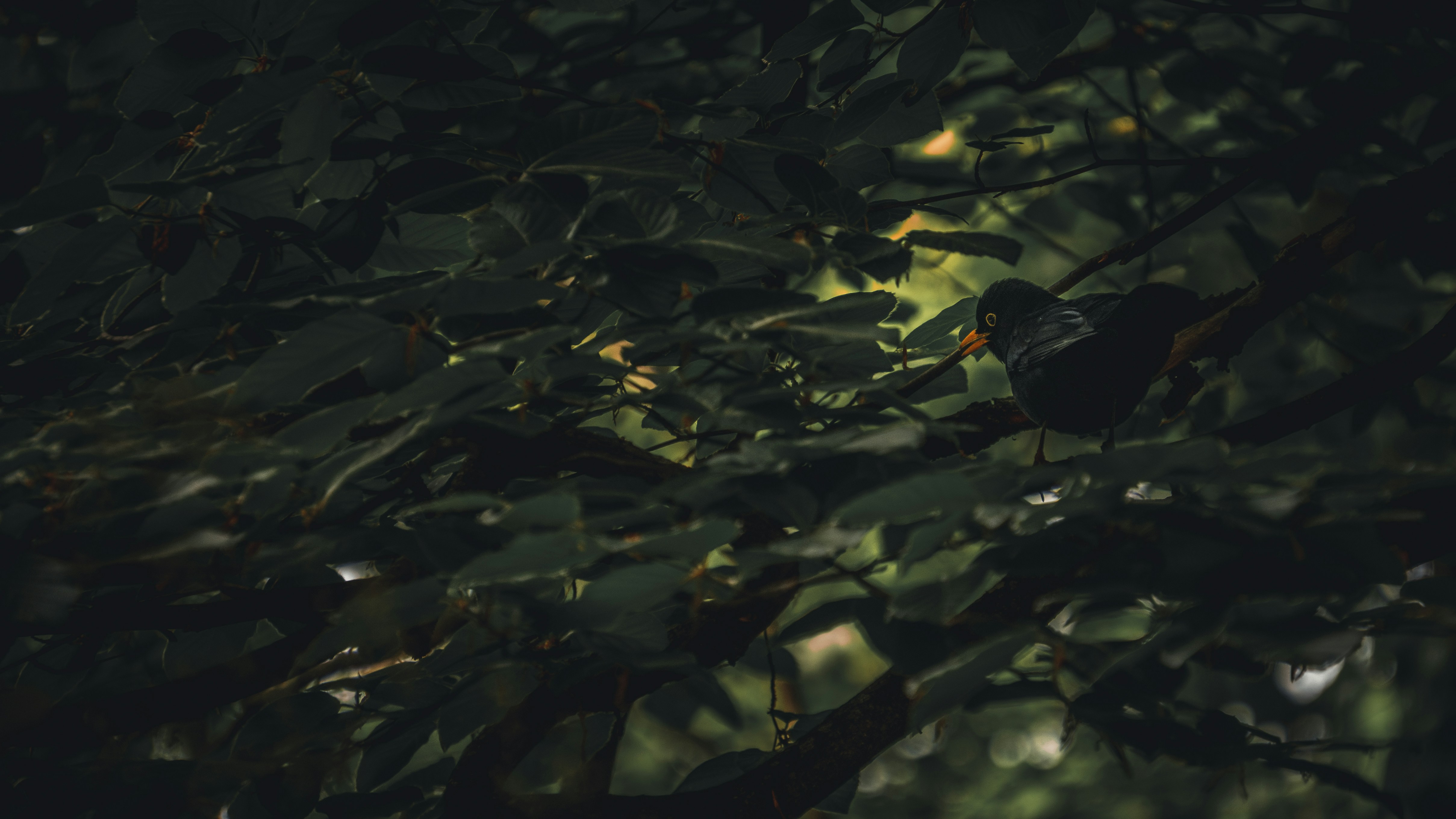 Leaves create a dark, mysterious, and shadowy backdrop.